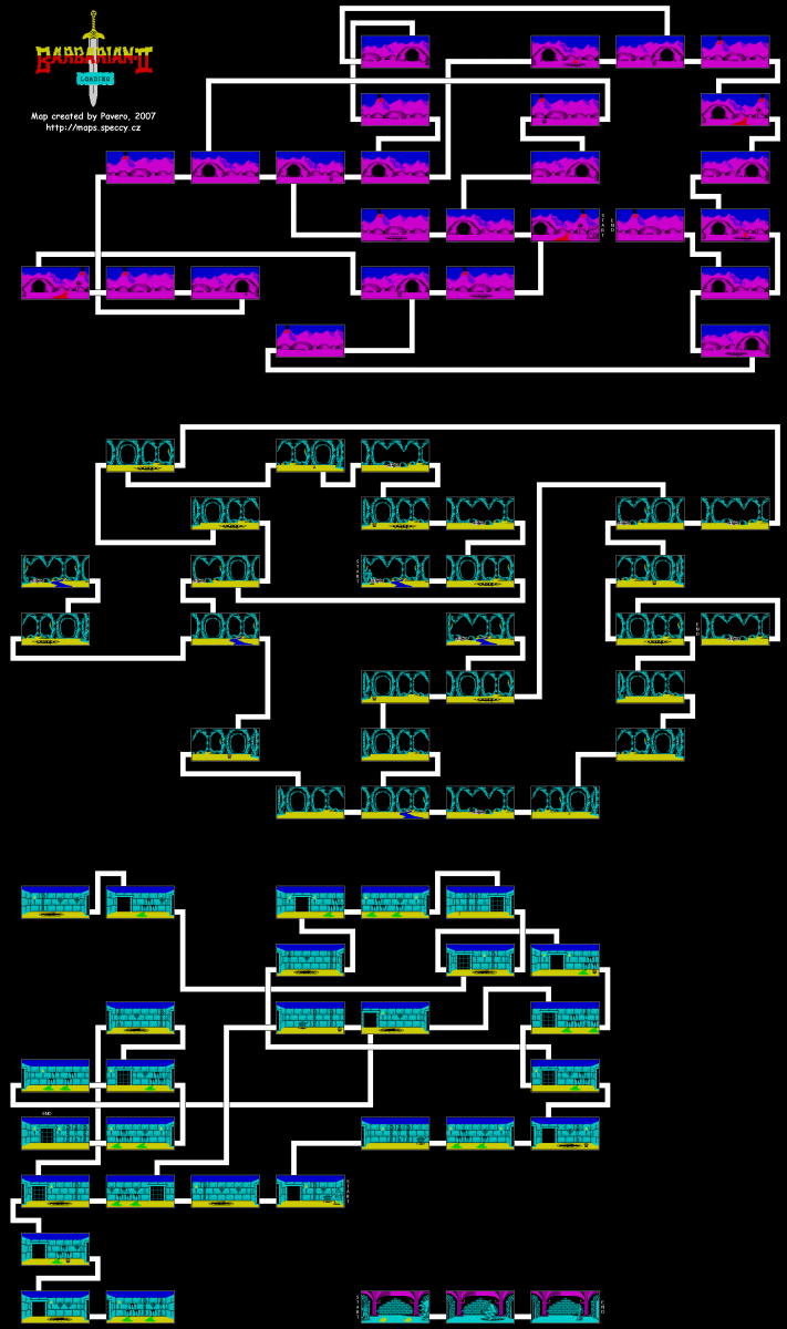 Каждый из первых трех уровней представляет собой лабиринт, состоящий примерно из 28 экранов. При просмотре каждого экрана можно идти влево, вправо или в двери или пещеры в задней части экрана.