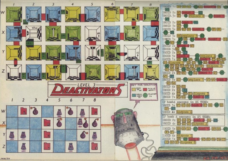 The object of the game is to remove all the bombs from five different buildings. You start on level one in a four by four building. The displays at the top of the screen provide a view of what is going on in two adjacent rooms. At the bottom of the screen is a map of the building showing you the positions of droids and bombs. Each droid is restricted in the number of rooms it can move between. Your score is shown in the box on the left, and any bonus droids you have available. The status box on the right shows whether the droid you are controlling is carrying either a bomb or a circuit board.