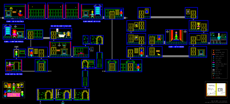 You are a Flunky, a menial servant, at Buckingham Palace. Although you are very obedient (yes Ma’am, certainly Ma’am, anything you say Ma’am), your real aim in life is to collect the autographs of the Royal Personages. As you stride around, carrying out your ordinary duty of lighting the fires in the Royal Apartments, you will meet some of the The Family. If you do as they ask, they will reward you with the autographs you seek. You may find yourself fulfilling all kinds of odd little duties for Andy, Fergie, Charles and Di. If you are truly skillful as a Flunky you may even manage to wheedle a signature from the Head of the Household – Her Royal Majesty herself. You start out with just a box of matches and your autograph book to help you, but there is room for one more article in your pocket provided it is small enough. You may find a bomb, a pistol or even a tugboat could come in handy in this strange household.