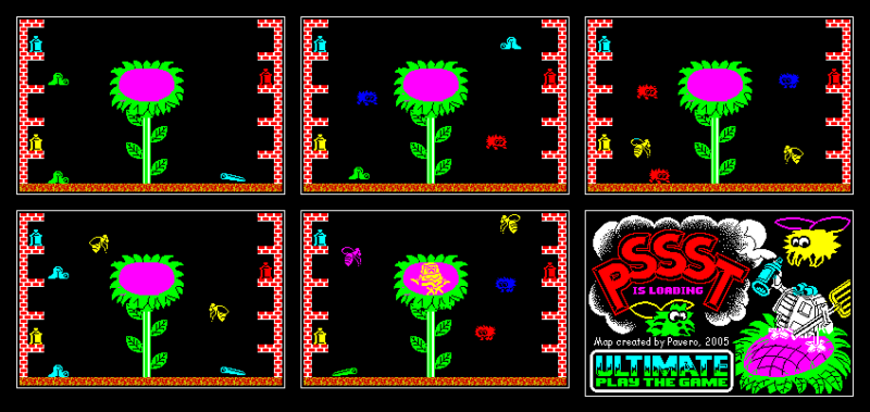 Играйте в Pssst без эмуляторов прямо на сайте. Аркада, которую подарил миру неизвестный автор, была опубликована творческой группой Ultimate Play The Game в 1983 году в Великобритании.