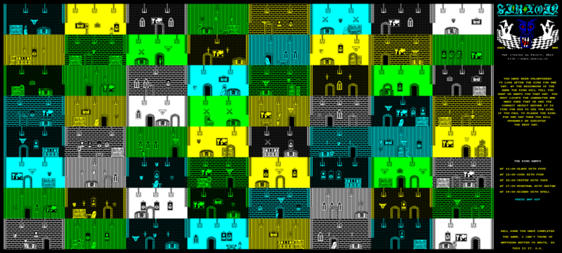 Все, что вам нужно сделать, это царю всего на один день. Дал вам список, который вы хотите видеть и то, что вы хотите, чтобы привести всех, и у вас есть, чтобы отделить все слуги, чтобы быть в тронном зале с правой объекта в нужное время. Единственная проблема заключается в том, что каждый служащий знает, что хочет король, но не то, что они должны дать. Так, сэр Поясница, вы должны пройти через замок и дать каждому то, что им нужно, или для вас будет конец!