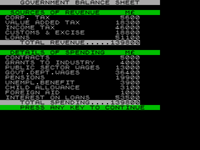 1) ПРАВИТЕЛЬСТВО БАЛАНС После начальных титрах вы увидите страницу с перечислением денег, поступающая в и из государственной казны. Как премьер-министр, вы должны знать, как Ваши деньги потрачены и какие источники дохода вы постукивая. Каждый раз, Вы играете 1984, вы будете наследовать эти цифры: