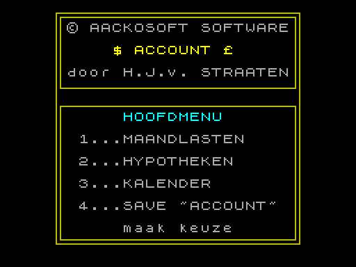 Для игры в Account не нужны эмуляторы. Программа для бытовых нужд, опубликованная в Нидерландах в 1984 году командой Aackosoft, которую разработал Henri van Straaten.