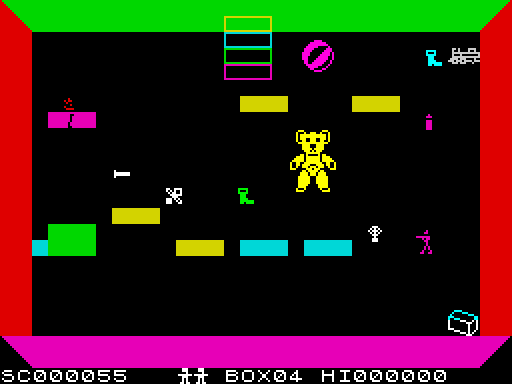 Вы управляете мишка пытается вернуться к его питомник через 99 ящики для игрушек (уровни). С помощью клавиш, идею каждого Уровень (Toy Box!), чтобы построить набор шагов из здания блоки, которые разбросаны. Есть гадости (уровень указывает число), которые будут перерабатывать Тед если он вступает в контакт с ними. Оружие можно забрать и использовать, чтобы убить гадости, однако если они все погибли, нерушимой особым поручениям кусок пластилина будет мешать вам. Чтобы временно приостановить что гадости, вы можете открыть Джек-в-в-коробке, коснувшись его.