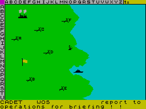 На карте показаны относительные положения вашего squadrone и рейдов противника. Ваши эскадрильи – один раз в воздух – будет показан в своей текущей позиции в белых чернил. Фактическая графический используется должны дать представление о заголовке эскадрильи. Вражеские налеты будут показаны – в красный – если они находятся в пределах радиолокационного покрытия. Эскадра или рейда номер будет отображаться под каждым символом, хотя вы можете выполнить данную этикетку, если бы экран становится слишком загроможден. Буквы вниз в сторону и вдоль верхней части карты определяют сетку квадратов, в течение которого воздушное судно может двигаться. Вы можете указать конкретный район патрулирования для одного из ваших эскадрилий с помощью этих писем. Первая буква следует читать сверху вниз: например. выбрать патруль на правой аэродроме F, затем введите “DN” в ответ на подсказкам на экране.