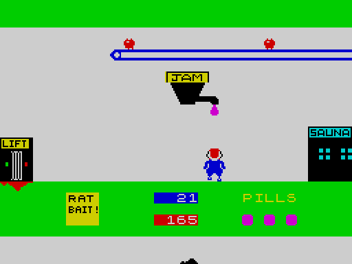 Eat as much jam as you can and as many apples as you can without getting too fat, otherwise you’ll have a fit and lose one of your pills; but you haven’t got many so jump into the sauna to slimm off, but while you’re in there the tiny rat will eat the jam and the apples you miss and get big and bold and come up to bite you dead, but you can jump into the lift to go up and down. So if your timing is right you can squash the rat and get on with eating to increase your score to release rat bait to keep the rat tiny, but beware the hornet zooming past (to be avoided at all costs) by jumping into the sauna, otherwise it will sting you dead and the ambulance will come to take you away. And the best of luck!
