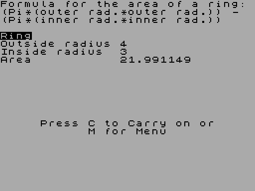 очищает и затем он просит первого измерения, это то отображает измерение данного и программы: – площадь / Прямоугольник, треугольник и кольцо попросить вторую Измерение. После того, как все измерения были введены и проверены Fied, экран очищается и формула отображается. Затем компьютер работает ответ и выводит его. Если вас использовать меню и все программы, затем измените каждый набор линий, которые говорят: –