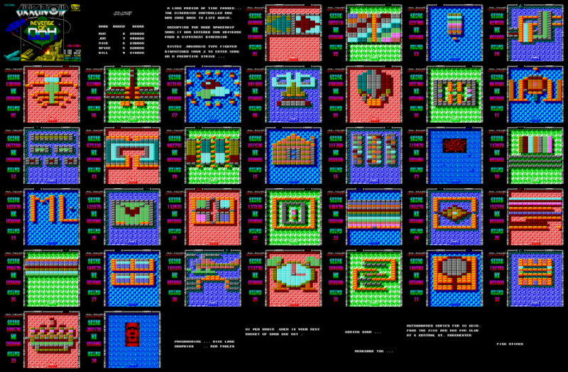 On-screen scoring displays score, hi-score, number of lives remaining and the level attained. Points awarded are between 60 and 140 for destroying a brick, depending on the colour. Hitting aliens scores 100 points and collecting a capsule gives you 1000 points. An extra life is awarded at 50,000 points and collecting a ‘P’ capsule.
