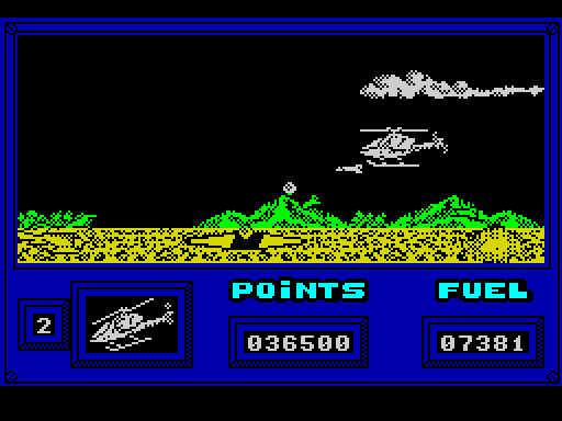 Comienzas la difícil aventura a los mandos de un jeep de combate equipado con misiles tierra-aire y tierra-tierra, atraviesas un puente, donde serás atacado por un terrible fuego cruzado y sólo puedes congiar en tu valor y tu sangre fría.