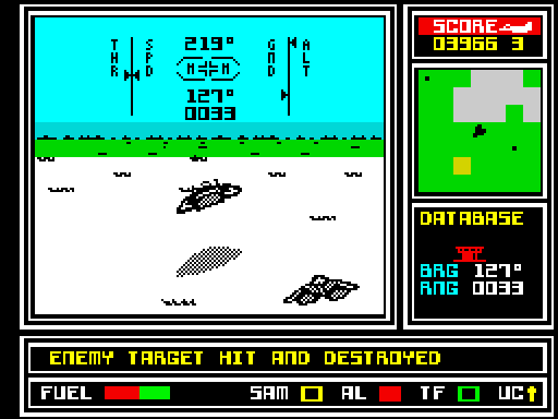 Beneath the main screen, further indicators show fuel level and undercarriage status (UC), and warn of incoming missiles (SAM). An in-flight message window gives vital information on your mission, and a short-range scanner to the side of the main screen shows the type of terrain below and nearby enemy objects. Approaching ground-to-air SAM missiles trigger a warning alarm and with luck you can jam them in time using the ATF’s onboard jammer.