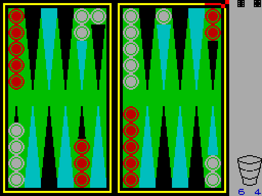 Запустите Backgammon и играйте. Это настольная игра, которую создал неизвестный автор, была издана компанией Oasis Software в 1984 году в Великобритании.