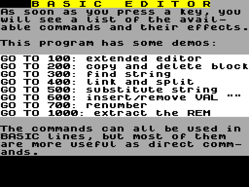 Для игры в BASIC Editor не нужны эмуляторы. Приложения для разработки программ на бейсике, изданное в Великобритании в 1993 году командой Outlet, которое разработал Francis G. Miles.
