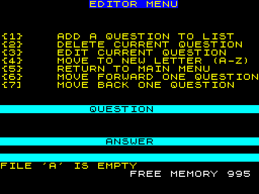 Письмо. Другой меню будет отображаться давая возможности добавить Вопрос, удалить вопрос, изменить существующий вопрос, снять на новый Письмо, двигаться вперед или назад на один вопрос, или вернуться в главное меню. Если есть вопросы уже есть, один из них будет отображаться в вопрос площадь под меню, вместе с мерой количества Вопроса свободного места для этого письма. Если вставить новый вопрос, его всегда будут добавлены на конце. Два альтернативных ответов может быть дано разделяя их косой чертой «/». Второй не нужно начинать с током Письмо.