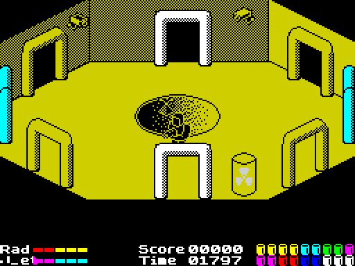 Когда вы опытный вы сможете Jetpack над сводом, нажав Огонь на полпути через выбросить за борт жезл. На правом нижнем углу экрана вы увидите остальные стержни, цветом, чтобы указывают полы, на которых они могут быть найдены. Используйте лифты пойти до, и квадратные отверстия в верхних этажах приехать (падение) вниз. Не тратьте время на борьбу с роботами. Используйте свой реактивный ранец экономически короткими очередями. У вас есть 30 минут!