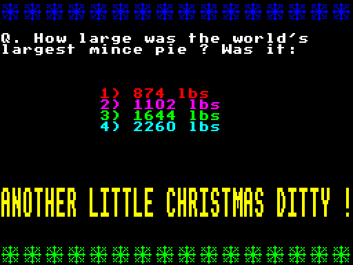 Можете начать играть в Christmas Trivia Quiz, The онлайн. Викторина, которую подарил миру Michael Silve, была опубликована творческой группой 16/48 Tape Magazine в 1986 году в Великобритании.