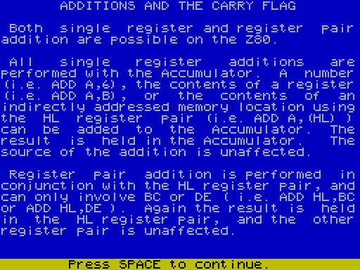 группы. При загрузке каждого раздела введение появляется на экране. Меню для группы уроки затем может быть получена путем нажатия Пробел, по крайней в любое время, пока на уроке или например. Нажатие ПЕРЕРЫВ (CAPS SHIFT + ПРОБЕЛ) вернет вас в меню.