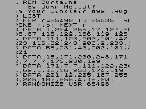 Lawks в Lordy, наш Джон, конечно, получает около. Его вторая Кусочек этого месяца является слегка больше пользы, чем C-Curve, хотя это не выглядит как хороший. Это очистка экрана рутина, в случае, если вы были клещ скучно с обычной Speccy CLS (или, действительно, в прошлом месяце Альтернативная CLS прог).