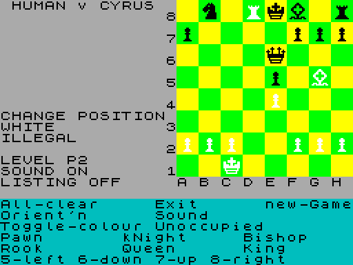 Если нажать D (сообщение: CYRUS v CYRUS), обе стороны будут сыграны компьютером – в качестве демонстрационной игры. Когда игра закончится, компьютер сделает паузу примерно на 20 секунд, а затем автоматически начнет новую. Чтобы остановить демонстрацию, нажмите любую клавишу; сделав следующий ход, Сайрус будет ожидать, что вы перейдете на сторону противника.