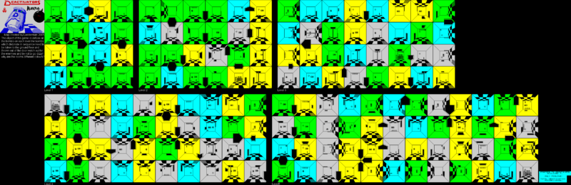 The object of the game is to remove all the bombs from five different buildings. You start on level one in a four by four building. The displays at the top of the screen provide a view of what is going on in two adjacent rooms. At the bottom of the screen is a map of the building showing you the positions of droids and bombs. Each droid is restricted in the number of rooms it can move between. Your score is shown in the box on the left, and any bonus droids you have available. The status box on the right shows whether the droid you are controlling is carrying either a bomb or a circuit board.