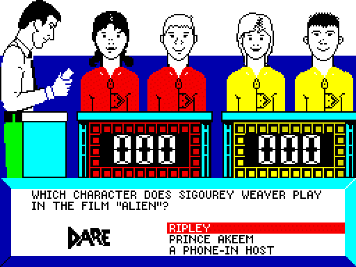 Запустите Double Dare и играйте. Это игра-викторина, которую создали Bizarre Developments, Richard Stevenson, Mike J. Lister и Paul A. Bellamy, была издана командой Alternative Software Ltd в 1991 году в Великобритании.
