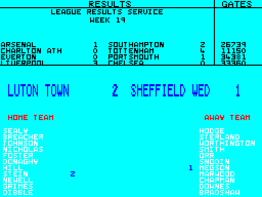 After selection of the team, select CONTINUE. The league match results with teams and players names, and goal scorers, will then be displayed. Each game will only take approximately TWO SECONDS to play.