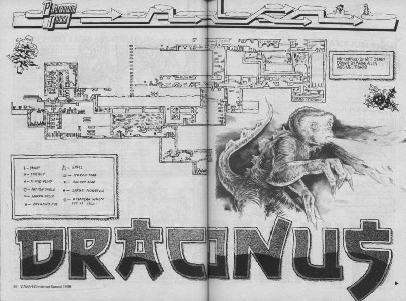 Draconus is set on an alien planet ruled by the Tyrant Beast who must be obliterated in the final screen of the game. To get to that stage the mysteries and magical forces, which unfold before you must be understood and harnessed to progress through this multi-screen epic. On your journey through the labyrinthine complex you’ll meet various nasties such as Giant Rats, Bats and Sea Serpents, together with a sprinkling of Terrortoads and ferocious Catepelones. To help you are many useful artefacts like the Demon Shield, Necromancer’s Staff, Dragon’s Eye, and Morph Helix. Flasks of Flame Fluid, Energy Crystals and many Spells help you on your way.
