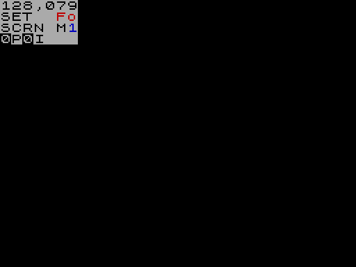 Чтобы изменить цвета на экране вы должны изменить от курсор пиксель – указано в SCRN информации Окно – к атрибутам курсора – ATTR. Ключ L будет переключаться между двумя курсорами. Курсор атрибут ведет себя так же, как курсором пиксела, за исключением того, что Характер размера. В режиме установок, это привлечет чернила, бумага, Яркие и флеш значения указаны в нижней части Информационное окно. Они могут быть изменены с помощью номера ключи. Ключи 0-7 изменится чернила – несмещенная – или бумагу – с CAPS SHIFT – цвет, ключи 8 и 9 изменится яркий – несмещенная – и вспышка – с CAPS SHIFT – значения.