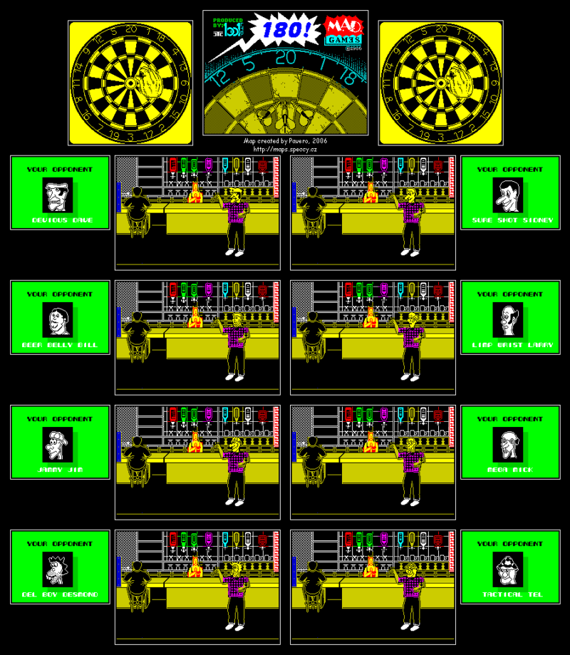 Можете начать играть в Дротики 180 (180) онлайн. Эта симулятор спорта, изданный в Великобритании в 1986 году творческой группой Mastertronic Added Dimension, который написали Binary Design Ltd, Ste Pickford, Jeremy Nelson и David Whittaker.