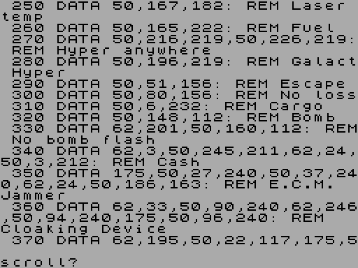 Во-вторых, есть в Мантия-невидимка, который иногда может быть получена При использовании Галактический гиперпространство, чтобы добраться до Галактики Two. По прибытии вы встретили группу довольно недружелюбной ВРУ, один из которых будет держать исчезают и вновь появляются. Если вам удастся убить его и забрать до его груза вы найдете Мантия-невидимка, который будет автоматически устанавливается на борту своего корабля. Она активируется с Ключ ‘Y’, после чего границы будет менять цвет и ваша энергия будет вверх и вниз с угрожающей скоростью. Используйте бесконечной энергии POKE к остановить это. Это устройство делает вас и ваши ракеты полностью невидимым для врага (можно еще увидеть ваши ракеты), поэтому они не могут быть ECM’d.