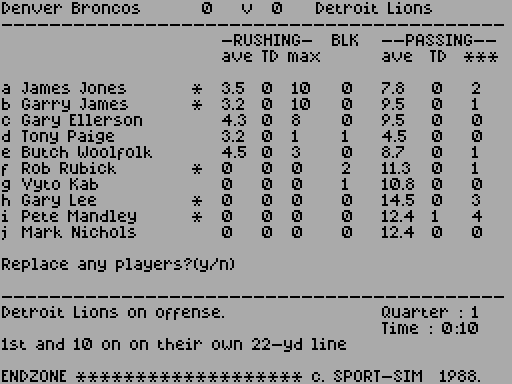 Сыграйте в Endzone – 87f Rosters прямо сейчас! Игра про спортивное управление, опубликованная в Великобритании в 1987 году творческой группой Sport-Sim, которую разработал неизвестный автор.