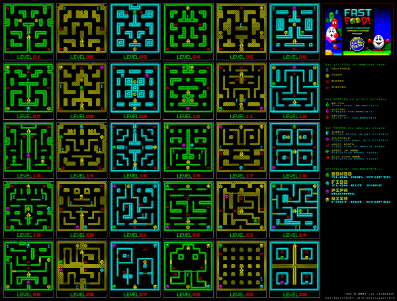 Запустите Fast Food (Быстрая еда) и играйте. Эта игра-лабиринт, выпущенная в Великобритании в 1989 году компанией Code Masters Ltd, которую написали The Oliver Twins, Neil Adamson, Adrian Ludley и David Whittaker.