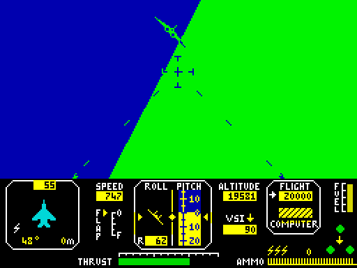 Во время полета самолет маневрирует с помощью рулей высоты, элеронов и руля направления. ЭЛЕВАТОРЫ управляются клавишами 6 и 7 (назад и вперед на джойстике) для наклона самолета вверх и вниз. Элероны управляются клавишами 5 и 8 (влево и вправо на джойстике) для поворота самолета влево и вправо. Наконец, управление рулем направления использует клавиши Caps Shift и Z для левого и правого руля. Руль дает как изменение курса, так и изменение крена. Во время пилотажных маневров эффективность управления будет разной. Например, при крене около 90 градусов управление элеватором будет оказывать основное влияние на курс, а не на тангаж. При крутом повороте самолет будет отклоняться носом вниз. Скорость тангажа, скорость крена и скорость рысканья (курс) будут увеличиваться пропорционально длительности управления. Эта функция дает хорошее приближение к ощущениям реального самолета.