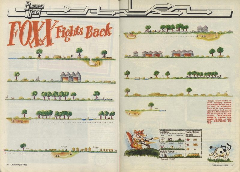 The word FOX in the bottom left hand corner of the screen contains your Pantometer; this represents how Foxx is feeling by the length of his tongue. Every time Foxx is hurt his stamina is reduced and after a while his tongue begins to hang out; it it gets too long he dies. Foxx must avoid jumping into walls as this will also kill him. Foxx will drown if he falls into the water. When you have lost a life the screen will scroll back to the beginning of the current section of the map.