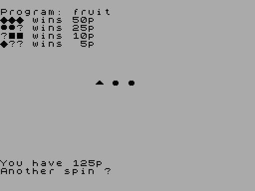Играйте в Fruit Machine без эмуляторов прямо на сайте. Эта игра жанра “гэмблинг”, изданная в Великобритании в 1983 году командой Granada Publishing, которую написал неизвестный автор.