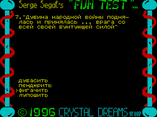 Игра Fun Test запускается прямо на сайте. Это образовательная программа, которую создали Serge Segal и Crazy Michaell, была издана творческой группой Crystal Dream в 1996 году в Украине.