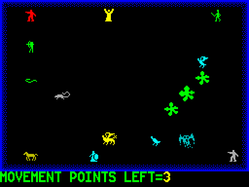 Press 1-8 to highlight your creatures. Using the cursor, select the creature you wish to move. Press S to select it, or I for information on it. Once selected, the screen will tell you the creature’s movement points.