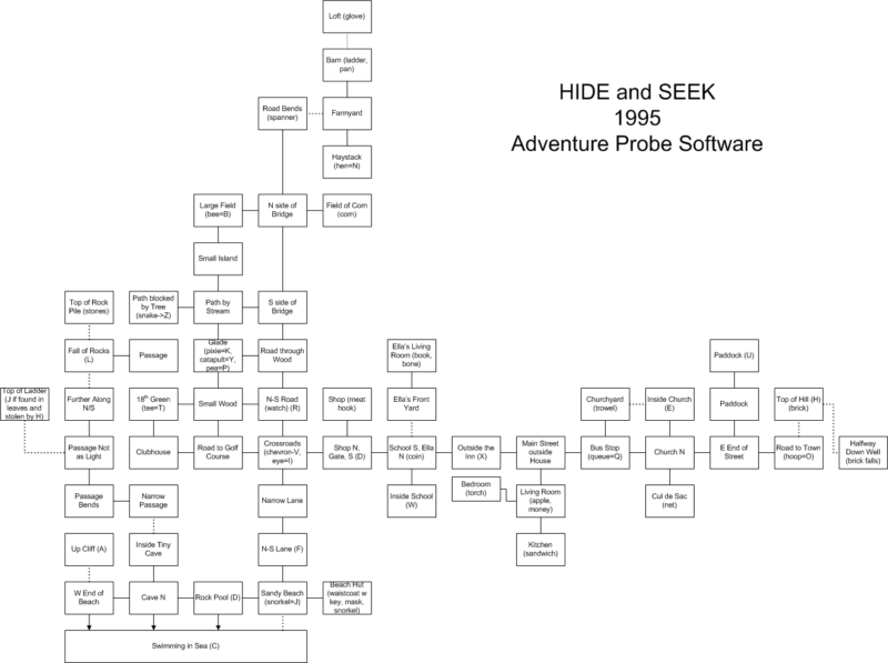 Можете начать играть в Hide and Seek онлайн. Это текстовый квест, который создал Edwina Brown, был опубликован командой Adventure Probe Software в 1995 году в Великобритании.