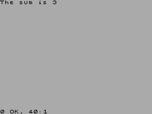 Не успели мы выйти этот пример, мы должны отметить, что вход является тот, который ведет себя немного по-другому в скомпилированный код, чем это делает в BASIC. Разница в это ответ на ошибки. В BASIC, ошибка на входе возвращает управление в редакцию с сообщением об ошибке. Это было бы неудобно в машинный код, так в скомпилированный код команды ввода ошибок в ловушке, так что какие-либо ошибочные результаты перезапуска INPUT. Проверьте это на себе с скомпилированного кода.