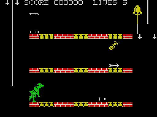 Квазимодо должны достичь Esmarelda заключен в замок крепость. Во время каждый из первых шести экранах он должен собирать бонусные колокола, или нажать колокола верхняя часть веревки (только экран 6), чтобы добраться до гигантского колокола, чтобы пойти к следующему, более сложному экране, который принесет ему ближе к достижения своей конечной цели (на экране 7, собирая все бонусы колокола), – чтобы спасти прекрасную Esmarelda. Зловещая крепость крепость чревато с опасности и грозных существ, таких как болиды, стрелок, летучих мышей и птиц и многое другое! После спасения Esmarelda вы можете продолжать играть с экрана один, но во все возрастающих уровня сложности, но держать вас подбородок, Квази может это сделать, если вы можете!