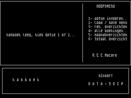 Играйте в Kasboek онлайн. Программа для бытовых нужд, выпущенная в Нидерландах в 1985 году командой Data-Skip Software, которую разработал R.C.E. Macare.