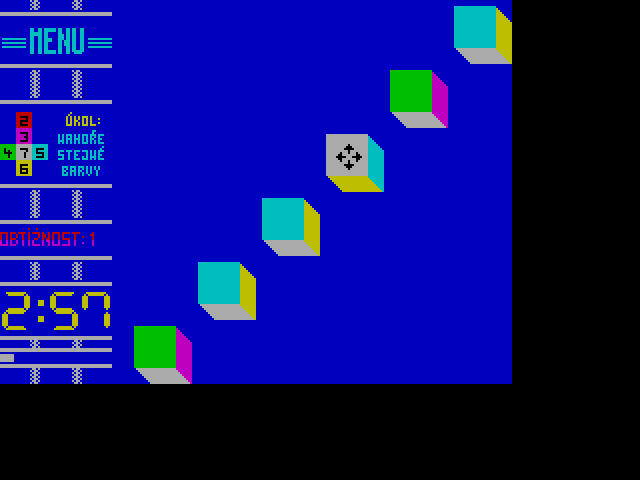 По odstartovani себе па obrazovce objevi Herní plocha с kostkami vlevo sloupecek с informacemi – vidite rozlozenou kostku с kurzorem (vidite я Steny, ktere jsou odvracene), zadani ukolu (Со помощник slozit), obtiznost (číslo ukolu) CAS, ktery VAM zbyva па skladani. Z kostky па kostku себе kurzorem pohybujete pomoci smeru, obcas musite kombinovat vodorovny в svisly Смер – kdyz JE kurzor па nejakem okraji hraci plochy вый zadate Смер вэн г hraci plochy, objevi себе kurzor па opacne strane. Radou Nebo sloupcem Костек otacite Tak, ге stisknete strelbu (FIRE) nejaky Смер.