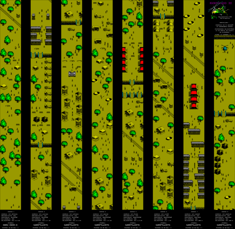 Komando 2 is a full-featured action game with a war theme. Our hero – a member of a special ambush squad has been dropped on a parachute into the enemy’s rear. His task was to use a special plastic explosive of extraordinary explosive power – semtex – to damage a nuclear reactor in which a neighbouring country produces plutonium for the nuclear warheads of its missiles. This task has been successfully accomplished and the aggressive enemy now has no chance to launch the prepared overwhelming atomic attack against the young independent state from which the soldier comes. But a second, no less dangerous part of his task awaits our hero after the successful sabotage. He has to fight his way through eight enemy territories to the ready helicopter that will take him to safety. But beware, it’s not just hordes of enemy gunmen that stand against our soldier. His second, equally dangerous enemy is the radioactive radiation from the damaged reactor, which is increasing in intensity by the moment. After loading the game on your computer, you can watch a small advertisement for the new game and read the opening credits. The text scrolls further by pressing any key. After this introductory part you will be taken to a small menu where you can change the controls. Pressing the 1 key will take you to the CHANGE KEYS option, where you can define the six keys that suit you best. You can also choose to control one of the Kempston controllers by pressing key 2 Kempston joystick, or key 3 Kempston mouse. In this case, one of these controllers must be connected to the computer before switching it on. After selecting the control, you can return to the menu with the SPACE key and choose a new control, or use any key to start the game. Once you start the game, you can no longer change the controls.
