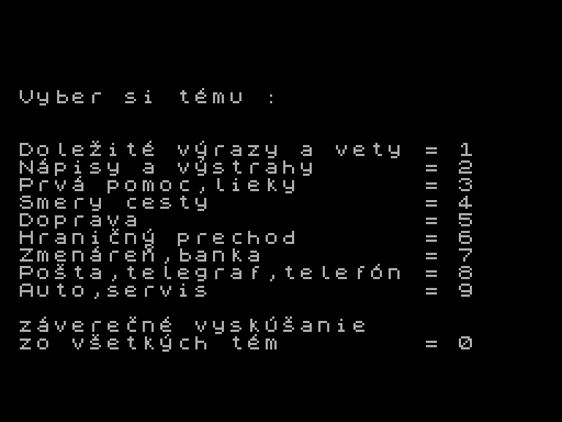 Бо vybere jednej г ма 1-9 буде программа vypisovat cudzojazycne vety ич preklad од zaciatku zvolenej temy. Volba 0 nevyucuje, sluzi IBA к zaverecnemu preskusaniu зо vsetkych ма. Stlacenim bodky “.’sa zahaji vyuka па Vete, ktora бола Праве vypisana. Takto JE mozne urcit, KDE ма vyuka zacat. Vypis Viet са да urychlit drzanim klavesy ENTER.