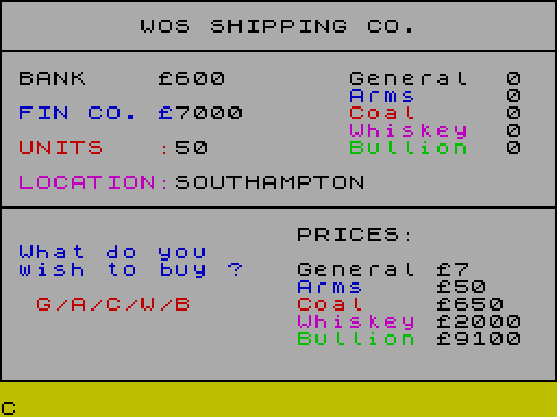 ГРАФИКА TRADING игры для 48K СПЕКТРА Вы являетесь счастливым обладателем «Титан Trader”, парусный спорт вокруг побережье Англии покупке и продаже товаров, где бы вы док. К сожалению, с экипаж требуя больше зарплаты, ваш груз стоит меньше, чем вы заплатили за него и пиратов от Порт лук, жизнь не легка для Master Mariner.