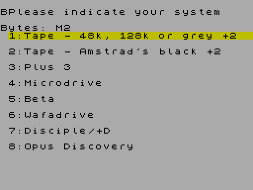 Вы должны остановить ленту и нажмите соответствующий номер, когда на экране появится меню. Версия 48К будет запустите компилятор, версия 128K потребует драйвер для загрузки с ленты, прежде чем делать так. При этом этап вы можете выйти из компилятора (нажмите клавишу вниз, то СИМВОЛ SHIFT & A), и сохранить ваш собственный основной загрузчик и компилятор на другую ленту, используя информацию, предоставленную ниже.