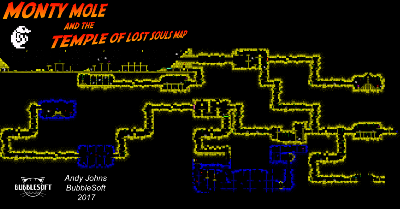 Запустите Monty Mole and the Temple of Lost Souls (Крот Монти и Храм Потерянных Душ) и играйте. Эта игра-платформер, выпущенная в Великобритании в 2017 году командой BubbleSoft, которую написал Andy Johns.