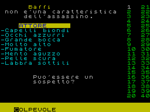 Запустите Murder и играйте. Эта игра-менеджмент, опубликованная в Италии в 1986 году компанией Load ‘n’ Run [IT], которую написал C. Girelli.