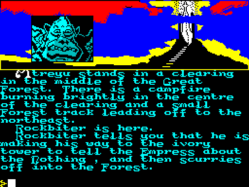The use of graphics in this game is quite different to some adventure games. Firstly every object has a small illustration; up to five can be carried at one time and they will be displayed at the top right-hand of the screen. If at any time, you have a companion with you (either Falkor or Artax) then their picture will appear at the bottom of the object display area. Larger illustrations for locations or depicting events appear in the top left of the screen and approximately one third of these are of the “Event” type. It should be noted that none of the graphics are designed to replace the text but to enhance it!