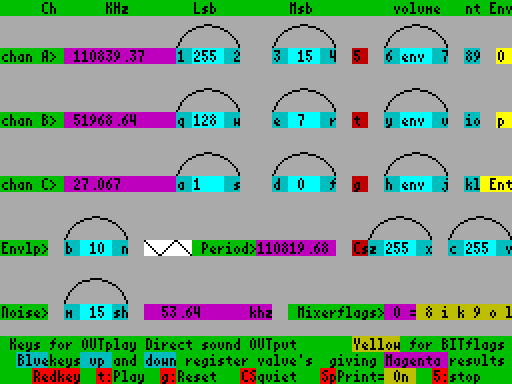 для ZX Spectrum 128k (или 48k с AY-интерфейс, но не проверял) Основная программа звукового найти новые звуки, экспериментируя с типом “открыт канал” от ПОДХОД. На реальном ZX Spectrum она должна быть возможность использовать все клавиши одновременно, хотя это замедлит результат dramaticly.