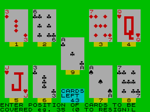 позволяют компьютеру делать. Было бы довольно легко написать Программа и просто наблюдать за игрой Spectrum сам по себе. Это Лучший, на мой взгляд, чтобы позволить игроку сделать довольно много, но отвергать ошибочные входы. С реальной колоды карт вы можете вернуться назад и исправить ошибку, если, например, вы неправильно сердце для бриллианта. Вы не можете сделать это без взлом программы, так что лучше, чтобы избежать этой проблемы. В то же время мы должны позволить неразумные, но не является незаконным движется.